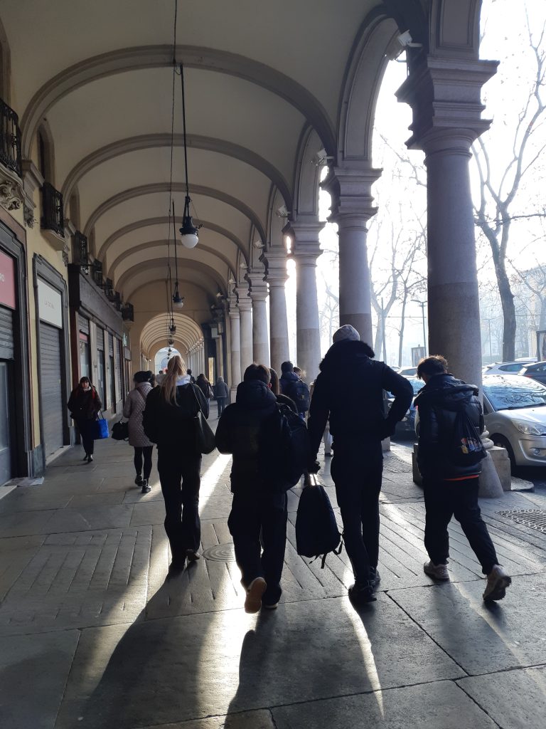 In giro per la città, sotto i portici.